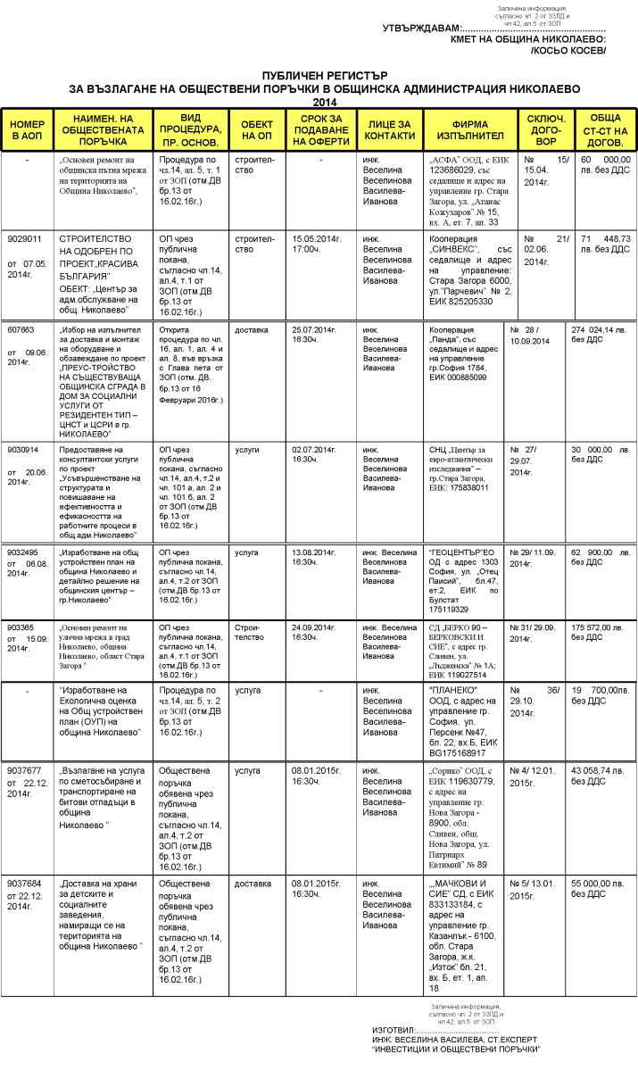 ПУБЛИЧЕН РЕГИСТЪР ЗА ВЪЗЛАГАНЕ НА ОБЩЕСТВЕНИ ПОРЪЧКИ В ОБЩИНСКА АДМИНИСТРАЦИЯ НИКОЛАЕВО 2014