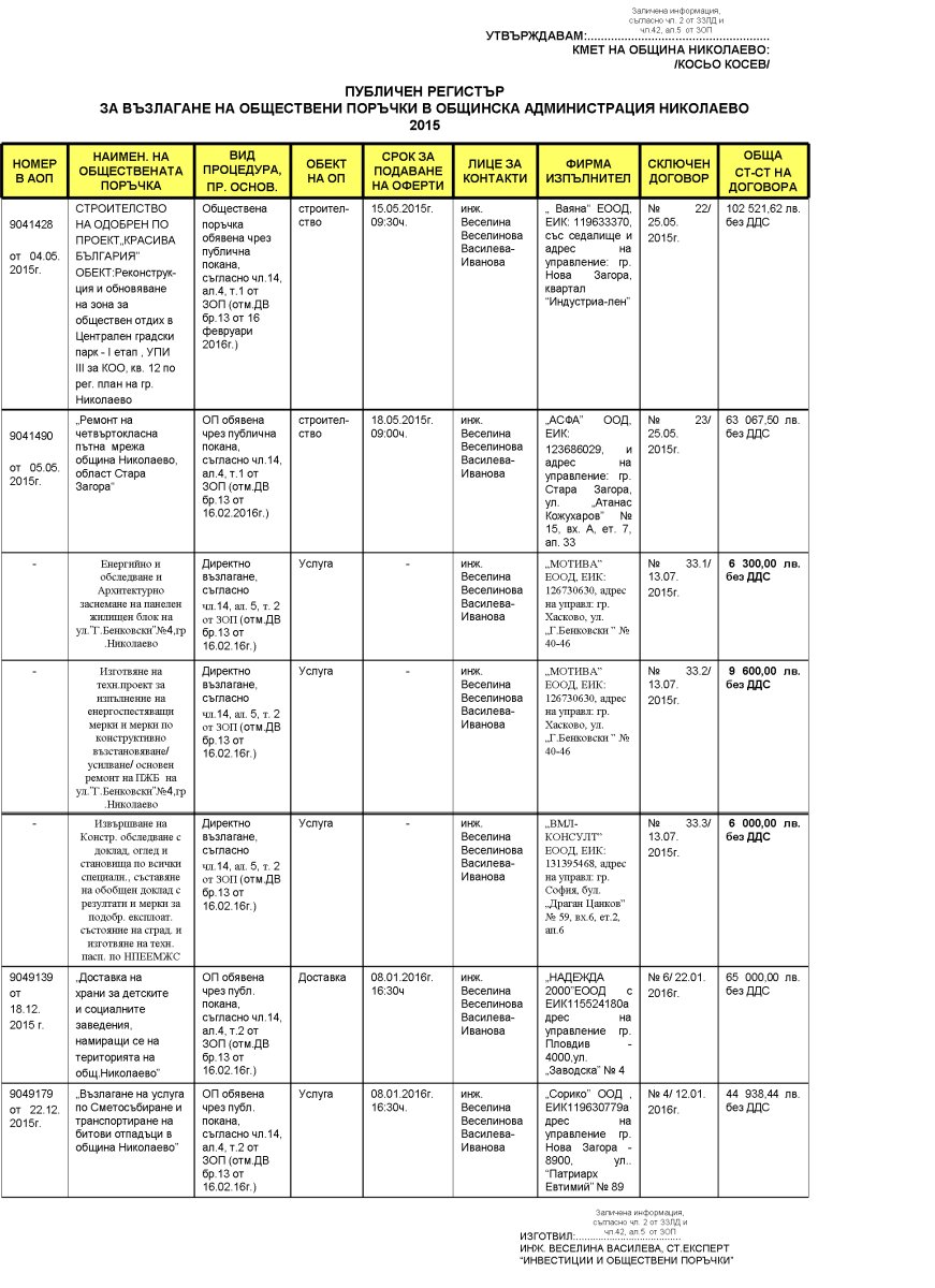 ПУБЛИЧЕН РЕГИСТЪР ЗА ВЪЗЛАГАНЕ НА ОБЩЕСТВЕНИ ПОРЪЧКИ В ОБЩИНСКА АДМИНИСТРАЦИЯ НИКОЛАЕВО 2015